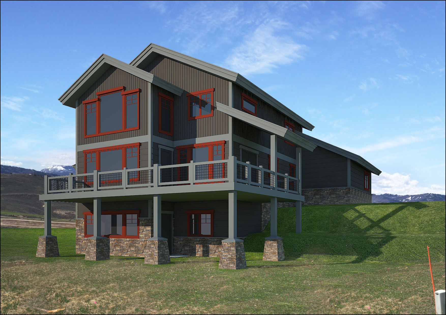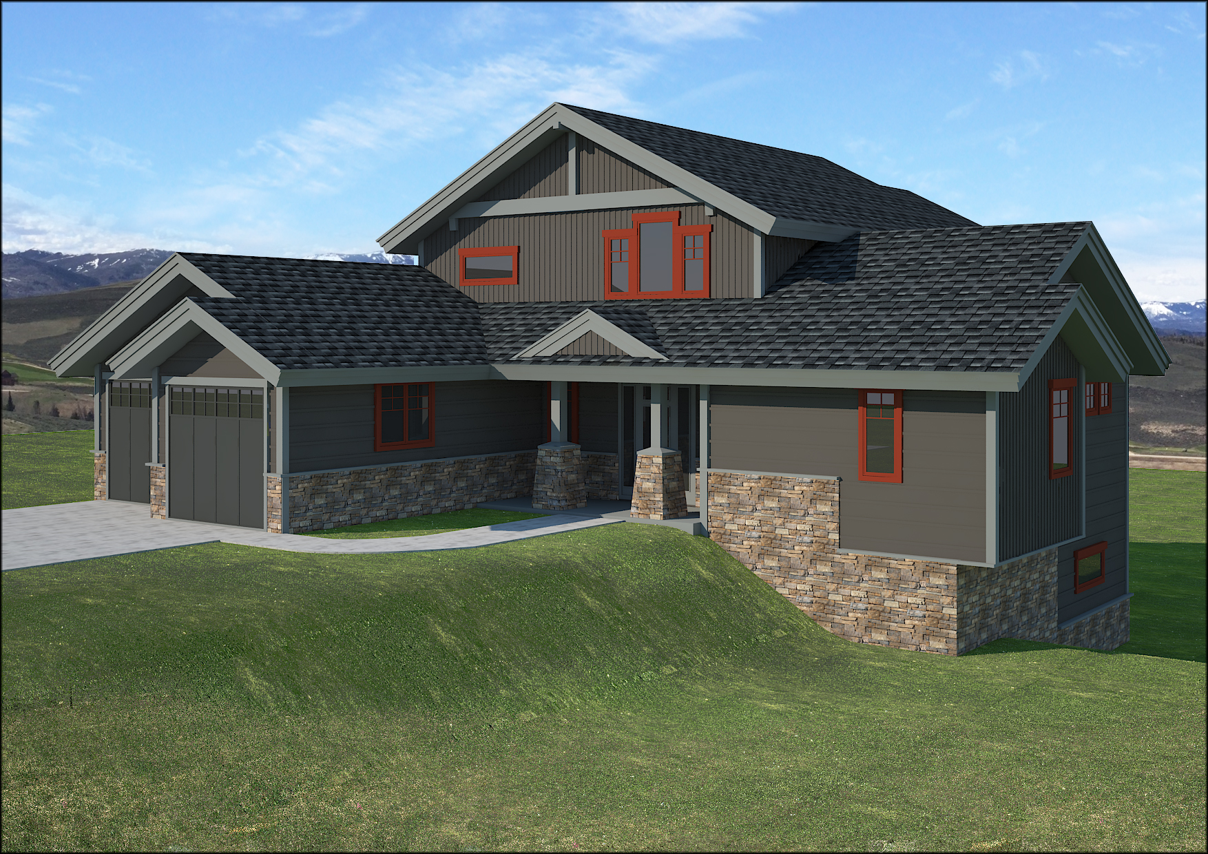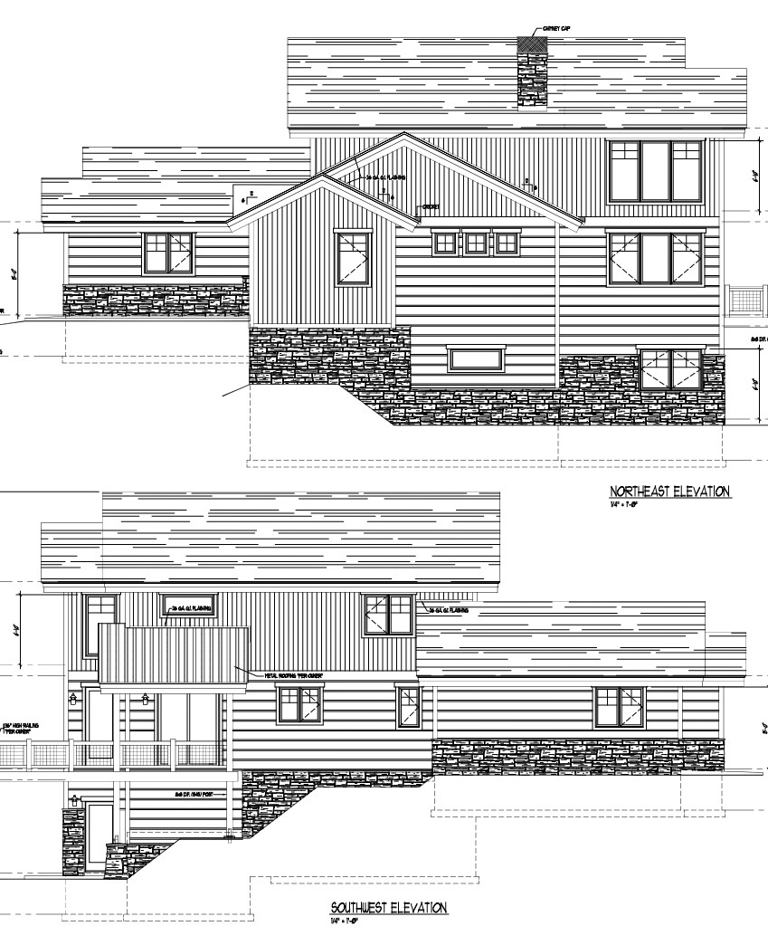 This 4025 sq ft home is designed with large families and groups in mind. It has 5 bedrooms and 4 baths. The master suite in on the main level. The bedroom includes a corner gas fireplace and includes double vanities, shower and soaking tub in the bath as well as a large walk in closet. The center of the main floor has a vaulted ceiling in the Great room open to the loft above and a corner fireplace. The kitchen includes hardwood cabinetry and a large eat in Island with granite tops. the main floor will have hardwood flooring and tile in the bathrooms. The upper loft has 2 bedrooms, a full shared bath and a spacious loft area for a game room or study area. Loft has hardwood floors, bathroom is tiled and bedrooms have carpet. the lower walkout basement has 2 additional bedrooms and another shared bath as well as a family room with a sliding door out to the rear patio. The main level has over 550 sq ft of deck and porch area on the rear of the home to maximize enjoyment of the local views. The interior trim and doors are solid knotty Alder with beautiful stained deep grains. The great room is adorned with a huge window wall to let light into the core of the home and enhance the mountain views. This home is best suited for a lot that slopes down from the road.